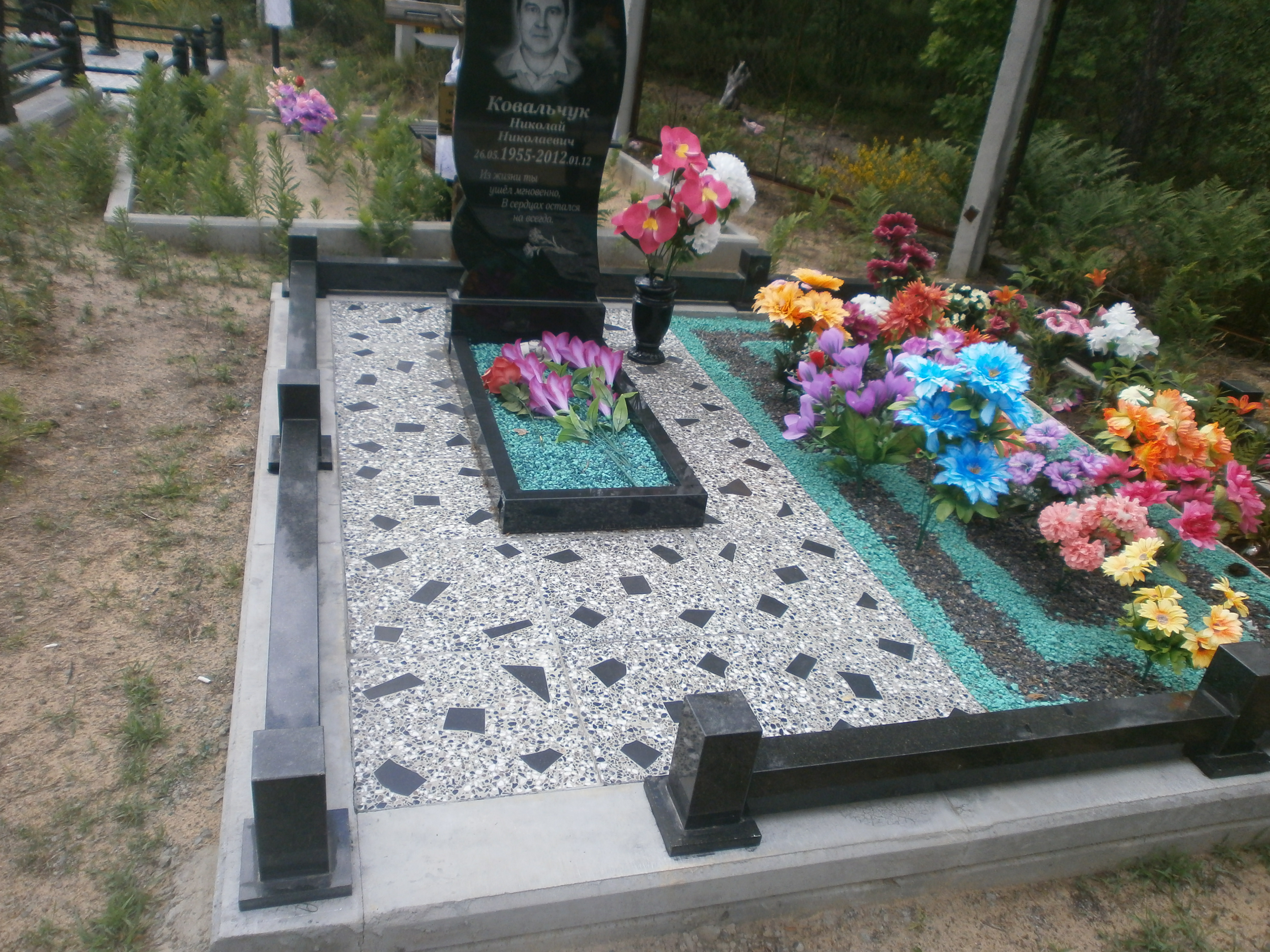 Вазы, лампадки из искусственного камня характеризуется прочностью, стойкостью к выцветанию, механическим повреждениям, не лопаются зимой. При установке могут монтироваться на раствор либо клей «Сикофлекс». Все изделия могут выполняться однотонными либо с фактурой гранита в цветах – черный, темно-серый, красный. Декоративный щебень широко используется для благоустройства, декорирования и окультуривания мест захоронений, придавая участку ухоженный вид. Засыпка щебня на пленку или цементную стяжку предотвращает прорастание сорняков, защищает элементы памятника и ограждения от загрязнения песком во время дождя.